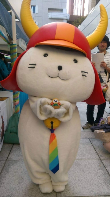 彦根市の近隣の豊郷町でのハロウィンイベントをお伝えするためやむを得ずこのような衣装をまとっておられます。ですが、もちろんステージの外では知らない人のフリをしたのは言うまでもありません。ひこにゃんもお世話係も目を合わせないよう必死です(;Д;)