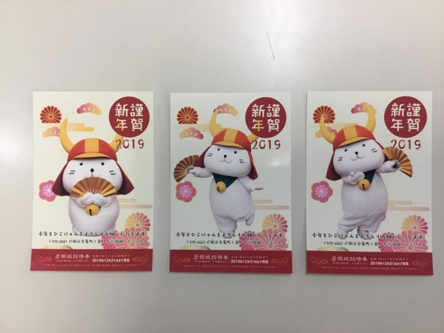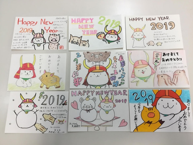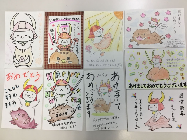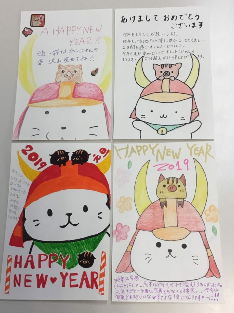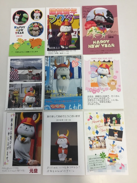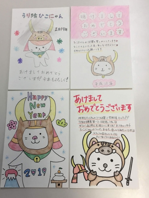 定番の「あけましておめでとう」の年賀状のほかにひこにゃんのイラストを書いていただいた年賀状がいっぱいありましたー。