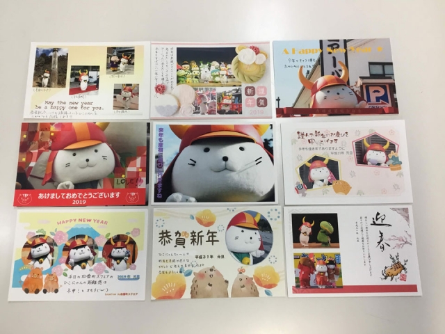 ひこにゃんの毎日のお仕事の様子や出陣の様子の写真をつかった年賀状もありましたー。