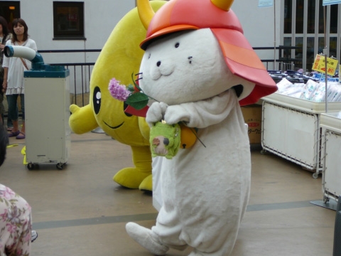 今回のメグリア出陣は、「滋賀・彦根物産展」ということで、JA東びわこのキャラクター「いっぴー」も、農産物のPRに来ていました。せっかくなので、「ひこにゃん」との共演でビンゴ大会に登場してもらうことに。(JAのキャラクターらしく、「いっぴー」の好きなものは、“ごはん”だそうです。)