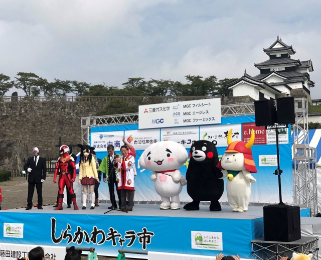 その後は、白河市のキャラクターのみなさんや「くまモン」と一緒に、小峰城をバックにオープニングステージにも登壇させていただきました。