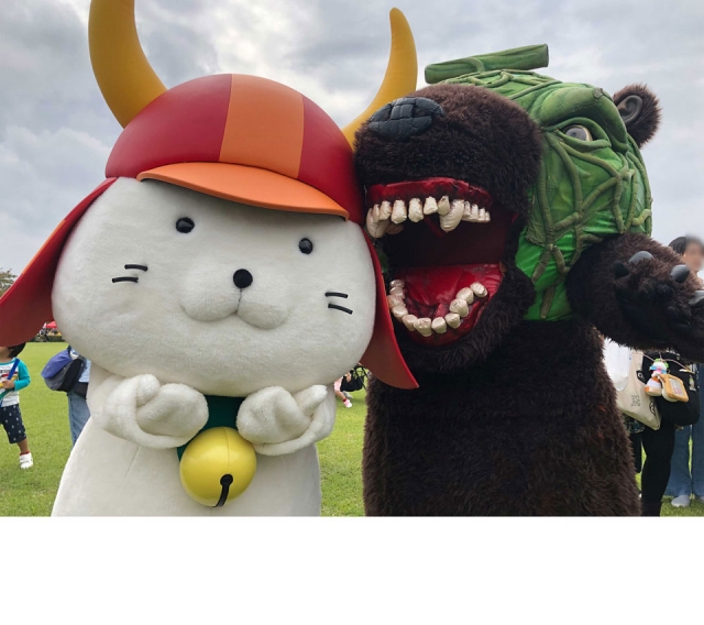 「くまモン」はひこにゃんの黄色い鈴に興味深々!