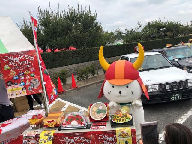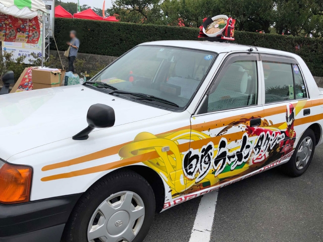 おいしそうな行燈が乗っている「ご当地タクシー」の展示ブースにも遊びに行きましたよー。白河市には「白河ラーメンタクシー」というのがあるんですね!