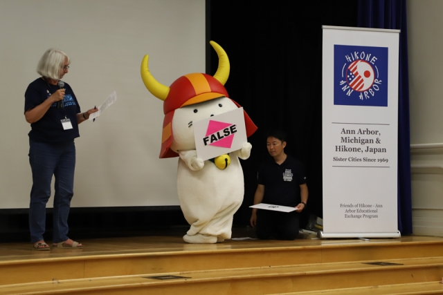 ここでは彦根市について○×クイズで問題を出し、ひこにゃんは彦根市のことをたーくさん教えてあげていました。