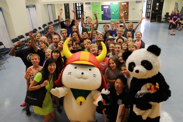 ここでは彦根ばやしの披露もしたひこにゃん。最後はレイクウッド校のマスコット、「トカゲ」になった校長先生と一緒にダンスしました。