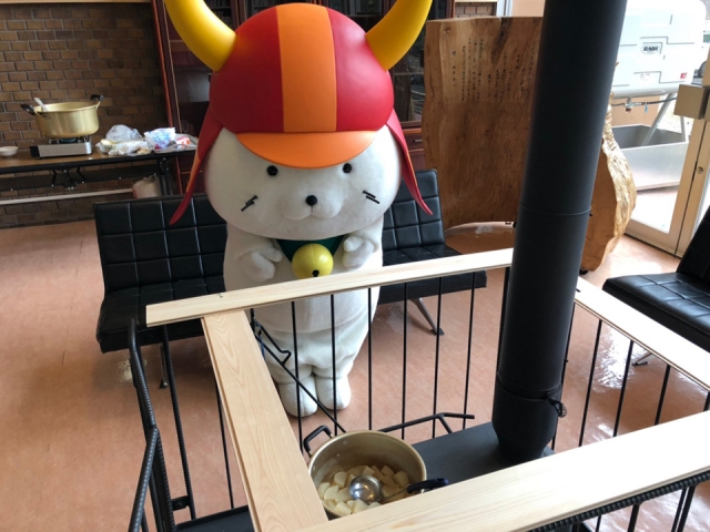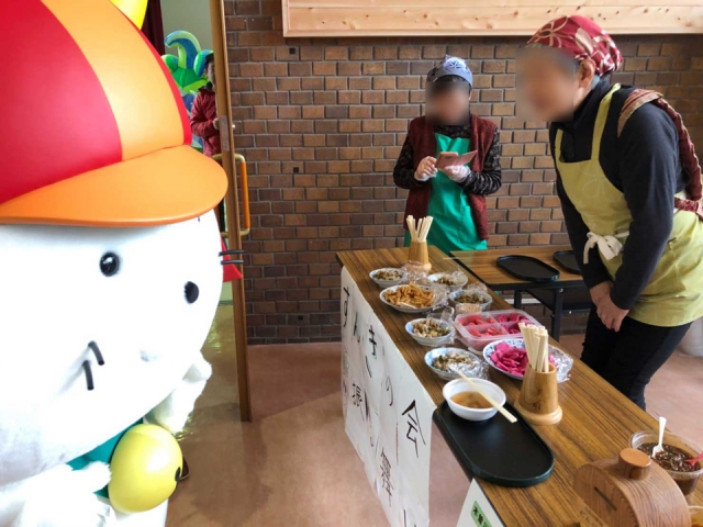 会場内では、地元の「すんきの会」の方々が、すんきと すんき汁の振る舞いをご用意くださっていました。じーっと見つめるひこにゃん… おいしそうだね~