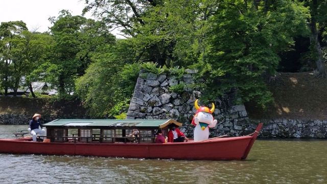 玄宮園前まで人力車に乗せてもらった「ひこにゃん」、今度は、お堀めぐりの屋形船に乗船させてもらいました。