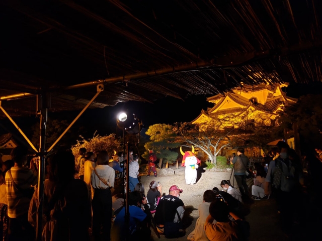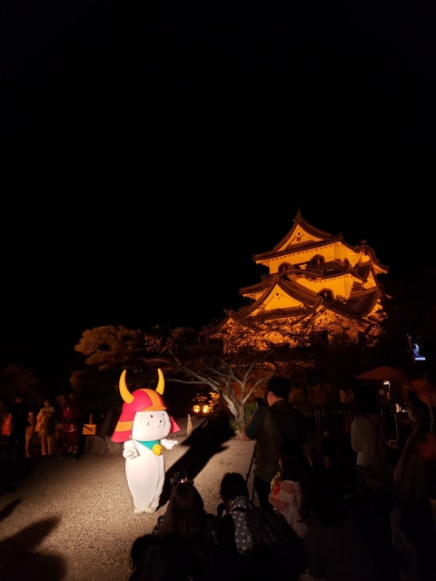 ひこにゃんも、お客様も夜の神秘的な彦根城で楽しそう!うらやましいです。