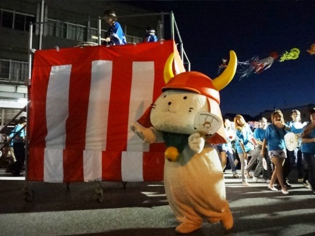 お次は、「彦根七夕まつり」の最終日である8月4日(土)に、中央商店街の特設ステージに登場いたしました。ほかの市内キャラも勢揃いです。