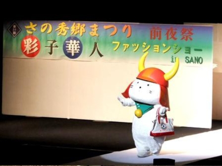 今年の秀郷まつりでは前夜祭も行われ、佐野市文化会館でファッションショーを開催されました。「ひこにゃん」も、舞台でNewモチバッグを初披露。気分はまるで、ファッションモデル?
