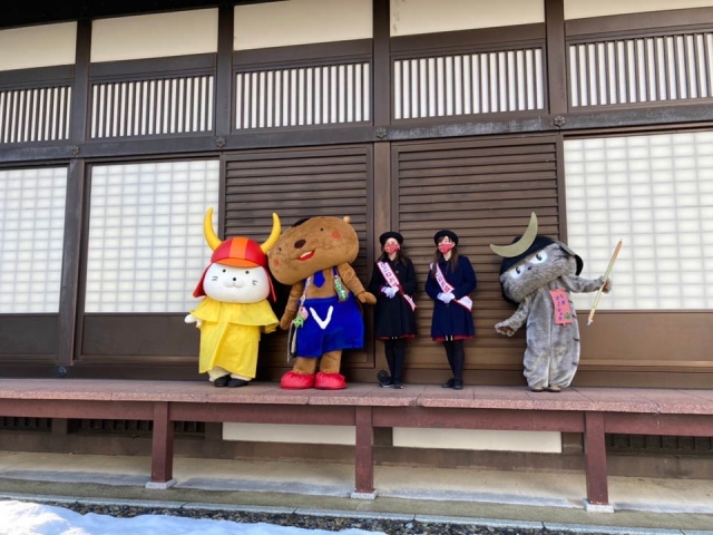 いつもの冠木門へは、お城大使のお姉さん、ビバッチェくんとしまさこにゃんも来てくれました。