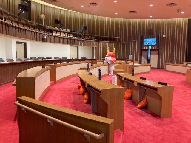ひこにゃんはキリリとした表情で議場を見渡していました。