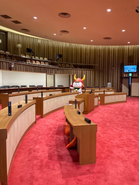 キャラさん達が議場に集まる前。議場内をチェックしてまわるひこにゃんです。