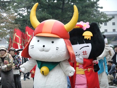 城まつりパレードが開催された11月3日には、実は彦根駅前で井伊直政公顕彰式も行われ、そちらにも「ひこにゃん」は参加させていただきました。そのときの写真を一枚。