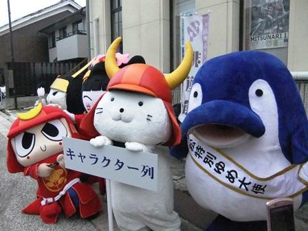 パレードはこの後も、城東小学校まで続きますが、「ひこにゃん」含め、キャラクター列のみんなは、俳遊館にて皆さまとお別れです。先に到着していた高松特別ゆめ大使の「ことちゃん」とも合流し、みんな揃ってはい、チーズ!(あれっ、「さのまる」の姿が見あたらない…。)