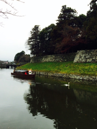 白鳥の先導で屋形船はゆったりと彦根城内堀を進みます。