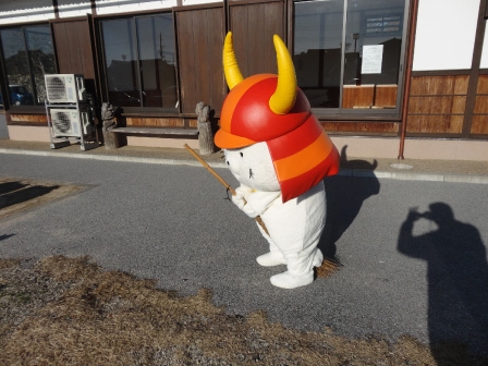 ひこにゃんがお掃除してる写真。ひこにゃんの小股の中にホウキが入ってる。笑笑