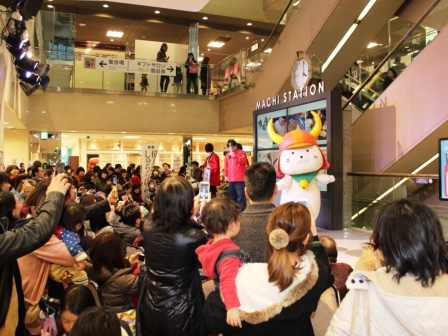 つづいて、映画館のすぐ近くにあるショッピングビル「天王寺あべのHoop」前のイベント広場に登場しました。屋外での登場ということもあって冷たい風が吹き付ける中でしたが、大勢の見物客やファンの皆さんに集まっていただきました。ひこにゃんもお世話係と一緒に元気に彦根のPRをお手伝い。