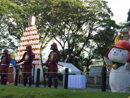 いよいよ、ひこにゃんの登場です。今回は夜会を盛り上げるべく、彦根鉄砲隊の皆さんも一緒です。