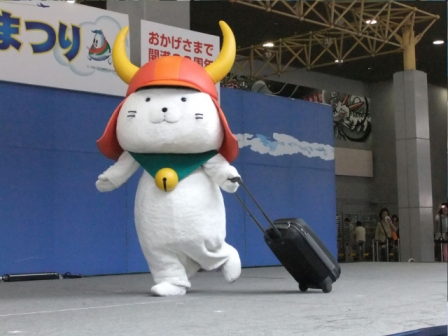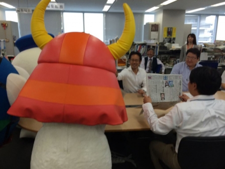 お次は、関空夏まつりです。毎年お声をかけていただき、今年でなんと7回目の参加となりました。Facebookでもお伝えしておりましたが、お写真はおまつりの事務局をされている新聞社にお邪魔したときの様子。企画会議に参加するなんて、ひこにゃんデキる猫ですなぁ。