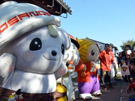 何と、彦根と親善都市の佐野市より、市長さんとさのまるくんにもご参加いただき、一緒にオープニングパレードの行進をしました☆