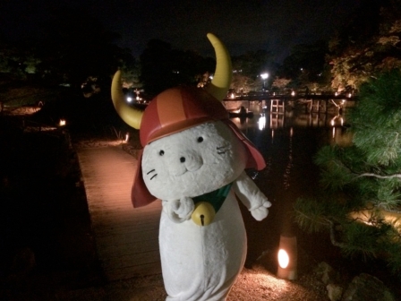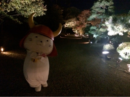 紅葉とほのかな明かりの中、佇む「ひこにゃん」。中々、みやびでしたよ♪