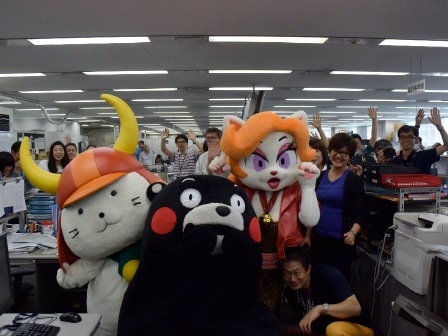 こちらは一緒に表敬訪問しました「くまもん」「船場リリィ」と一緒のショットです。後ろには社員さんと一緒です。みなさん楽しそうで何よりです。