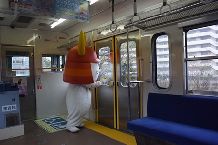 さて、ショックからすばやく立ち直った「ひこにゃん」は、ついに念願の電車に乗り込みました!