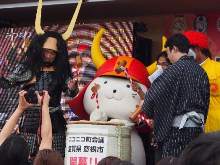 「ひこにゃん」はもちろん、市長(左の石田三成甲冑を着た人)もかけつけてオープニングステージ登場です☆