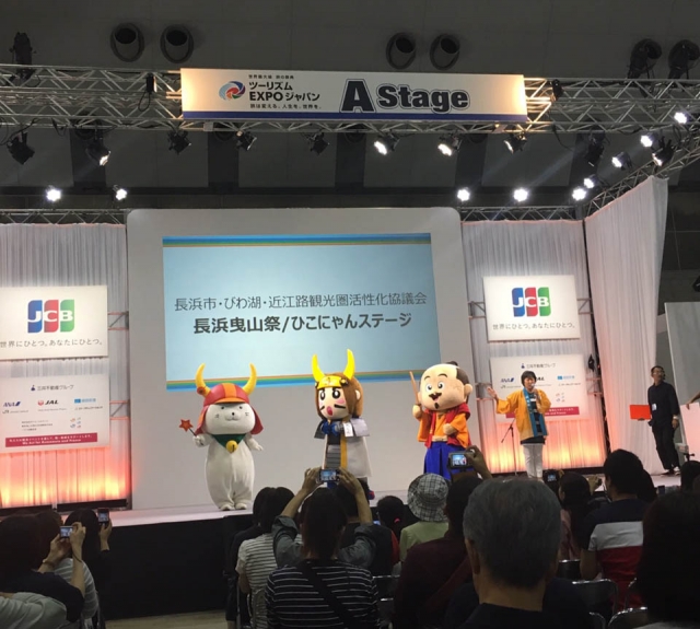 また、長浜市キャラクター「秀吉くん」・「三成くん」とも一緒にPRステージに登場☆キャラクターの3人は2日間フル稼働で地元のPRに勤しんでくれました。