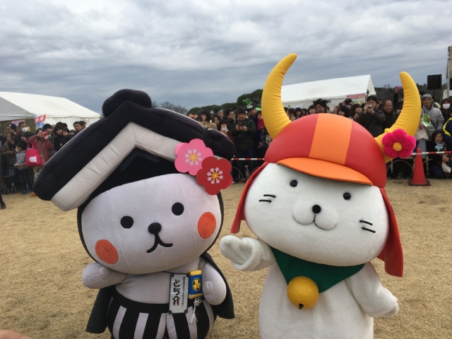 2月18日(土)・19日(日)の2日間は、親善都市の水戸市キャラクター「みとちゃん」のお誕生日会があるということで、「ひこにゃん」もかけつけましたよ!