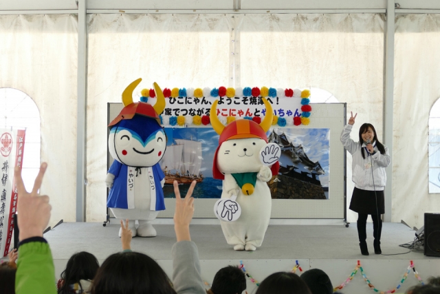 いよいよ開催まで一月と迫った「国宝・彦根城築城410年祭」のPRのため、普段よりひこにゃんの力が入ったステージが繰り広げられました(いつもどおりのまったりステージに見えるのは気のせいです)。