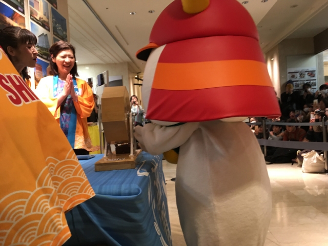 カウンターの高さがギリギリでしたね。体をメイいっぱいのばしてお店の焼津市特産をPRするひこにゃんでした。