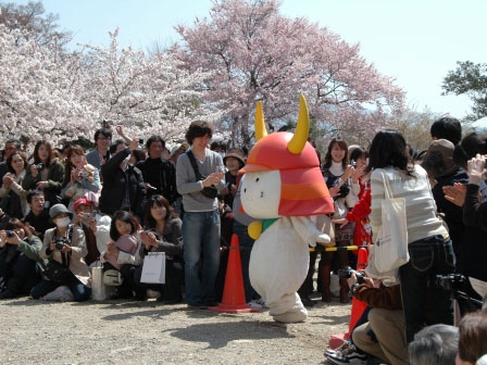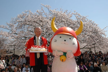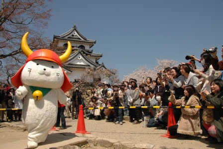 満開の桜と「ひこにゃん」です。新お世話係は、たくさんのお客さまにお集まりいただいたこの光景にすごく感激いたしました。