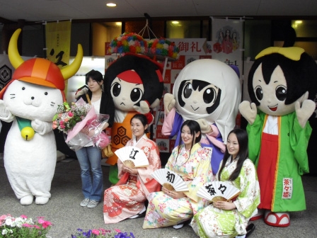 浅井三姉妹に扮した「長浜歴ドラ隊」の皆様とゆるキャラたちです。